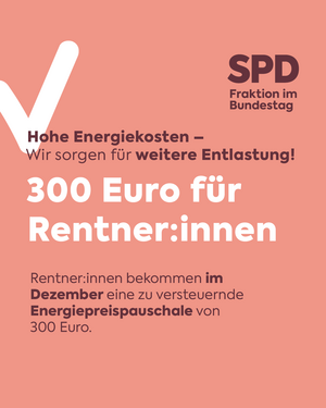 Wir entlasten Rentner:innen mit einer Direktzahlung von den hohen Energiekosten! Im Dezember wird eine steuerpflichtige Energiepreispauschale von 300 Euro ausgezahlt. ????